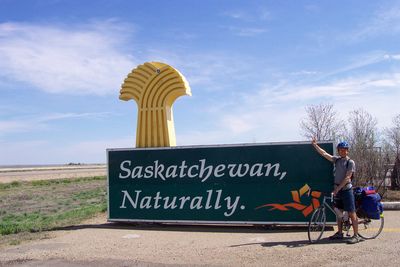 So we set out with the wind at our backs and the sun beating down on us. Our first destination was the Alberta-Saskatchewan border, which we reached within an hour. We took a few pictures and then continued on. By the time we ate lunch we had covered 112km and reached the town of Tompins. Following the short break, we continued on with our sights set firmly on Swift Current... even though we still had about 75km to go.