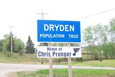 As we approached Dryden, dark clouds began to dominate the sky, blocking out the sun we have come so accustomed to seeing. All I could think about was getting to a campground and setting the tent up before the skies opened up. The first thing we saw as we entered Dryden was the sign showing the population, and right beneath it was a sign saying "Home of Chris Pronger". Our very first "Home of" town! It definitely warranted a picture.