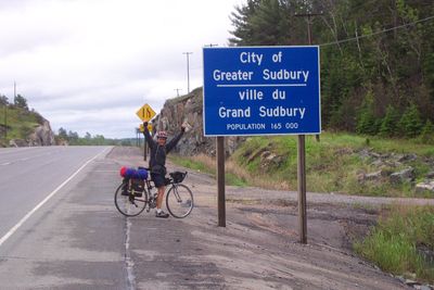 The afternoon was not quite as pleasant as the wind seemed to shift and began to hinder more than help us. Also, I was really feeling the effects of the cold feet as the temperature was lower than we have had the past few days. We continued on though and shortly after lunch we saw the 'City of Greater Sudbury' sign... ten feet later we saw the 'Sudbury - 54km' sign! Yes, the city encompasses a large area!